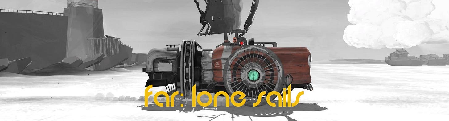 Uwielbiam gry doskonale odzwierciedlające powiedzenie "Jeden obraz jest wart więcej niż tysiąc słów", czyli produkcje, w których świat gry ma znacznie więcej do powiedzenia od dialogów. Mało tego - w niektórych z tych produkcji, jak w tym przypadku, dialogów nie ma zupełnie. Ale zamiast dialogów znajdziemy tu wspaniale wykreowany świat, w którym wydarzyło się... coś. Liczne wskazówki pozwalają domyślać się, co, ale w gruncie rzeczy to nieistotne. Znacznie ważniejsze jest to, że świat pozostały po tym wydarzeniu jest z jednej strony przesiąknięty zniewalającą pustką, a z drugiej strony - tak dużo w nim reliktów przeszłości opowiadających zadziwiająco ciekawą historię, którą chciałoby się poznać w pełni. Far: Lone Sails to mała, niezależna gra strategiczna polegająca na przemieszczaniu się steampunkowym pojazdem przez przepiękny, postapokaliptyczny świat okraszony cudowną oprawą AV. Podróż wymaga nie tylko regularnej konserwacji naszego... uh... okrętu? ciągnika...? - ale również gromadzenia porozrzucanych tu i ówdzie zapasów, ulepszania dostępnej machinerii oraz umiejętnego korzystania z pomyślnego wiatru wiejącego w tytułowe żagle. Jak w dobrej, choć krótkiej powieści, znacznie ważniejsza od celu jest tu samotna (ale nie cicha!) podróż. Bardzo się cieszę, że czytając recenzję drugiej części, postanowiłem zainteresować się jedynką, która tylko pogłębiła mój apetyt na Far: Changing Tides.